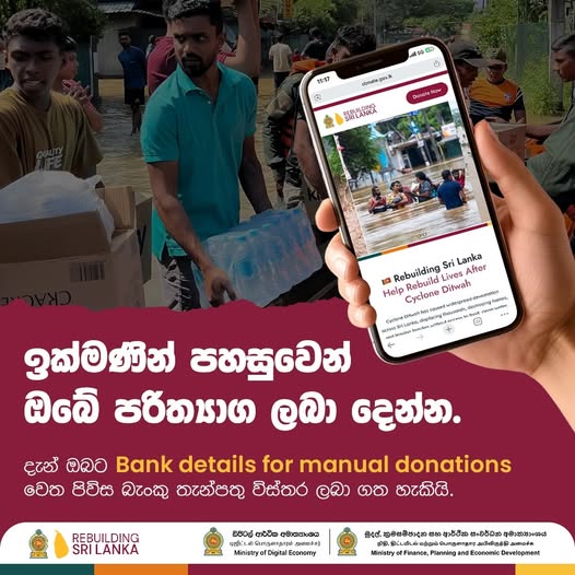 The Central Hub for All Verified Donations. Both local and international donors can now access the 'Bank details for manual donations' section to view all official bank deposit details. Your contribution directly strengthens national recovery operations www.donate.gov.lk