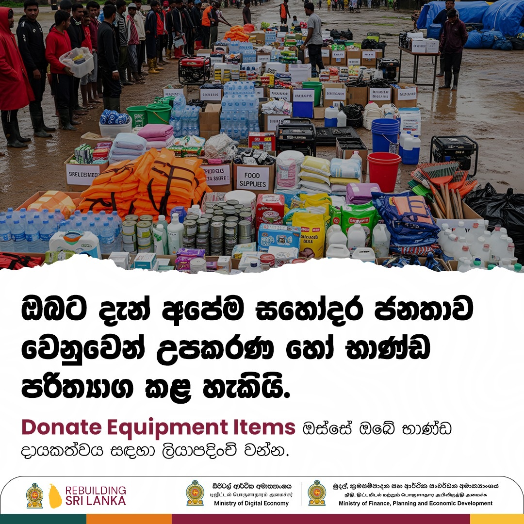 You Can Now Donate Equipment or Relief Items Contribute through the ‘Donate Equipment/Items’ section and support disaster-affected communities in need. All donations are exempt from duties and taxes under the government’s emergency relief process. Sri Lanka Needs Us. Now. www.donate.gov.lk