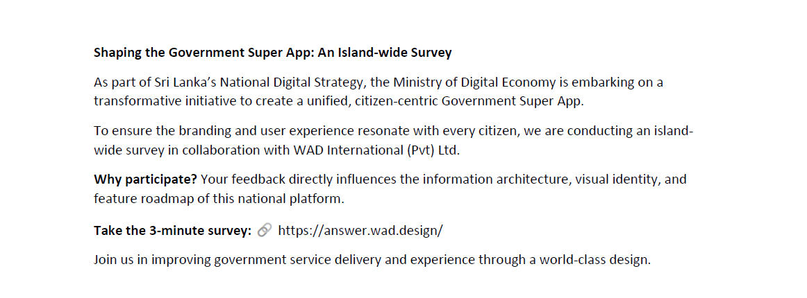 Shaping the Government Super App An Island-wide SurveyFebruary 18, 2026Take the 3-minute survey: https://answer.wad.design/