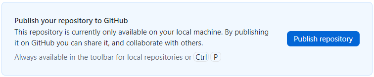 Now we do have 2 branches and we can proceed to Publish / Push the changes to GitHub. Click on Publish repository.