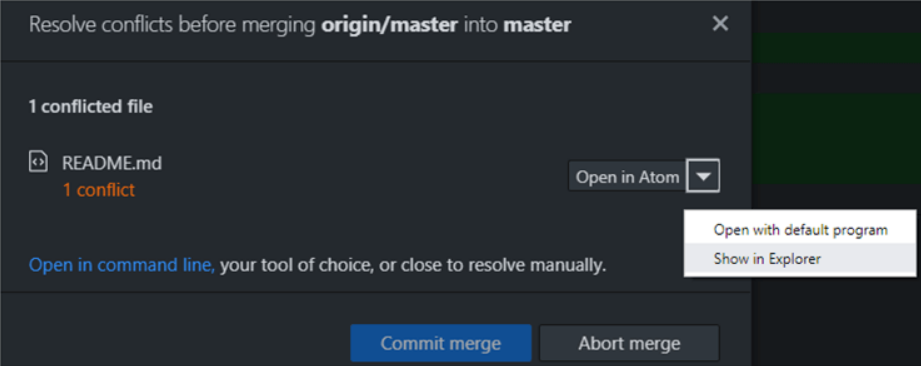 In the screen that comes up, you can open the file in your editor and resolve the conflicts. In this case, we are opening the file in explorer and resolving the conflicts.