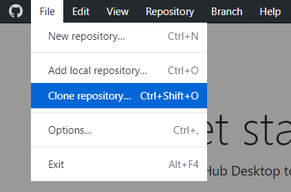 In GitHub Desktop, to clone a repository select File => Clone Repository