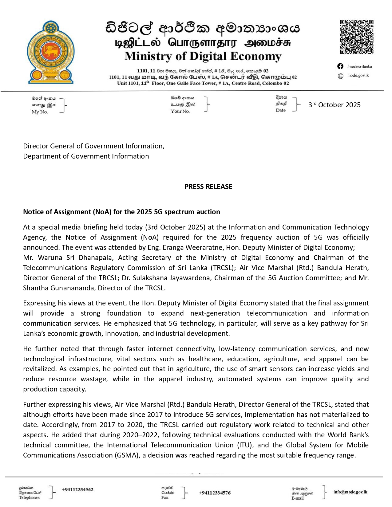 Notice of Assignment (NoA) for the 2025 5G spectrum auction