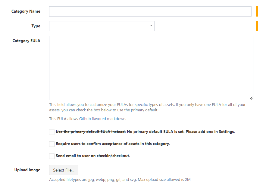 - Type - Select what types are used in this category. (Asset, Accessory, License, etc.)
