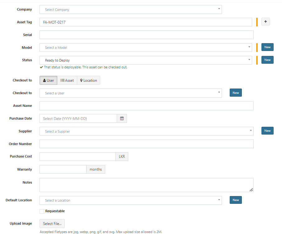 Image - Upload the asset model image to the system. Supported formats are jpg, webp, png, gif, and svg.